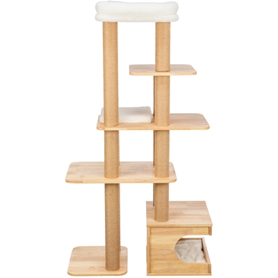 De Trixie Krabpaal Thiago combineert een natuurlijke uitstraling met slimme details voor katten die graag klimmen, rusten en krabben. Gemaakt van gewaxt rubberwood en bekleed met zacht pluche, biedt deze krabpaal meerdere lig- en speelplekken. De jute omwikkeling op de palen ondersteunt het krabgedrag. De schuilplaats bevat een wendbaar kussen, geschikt voor handwas, en het bovenste ligplateau heeft een afneembare mand met rubberen trekkoord.