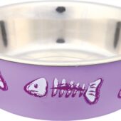 Een sterke RVS katten drink en voerbak met een leuke afbeelding van een visgraat met antislip op de onderkant.